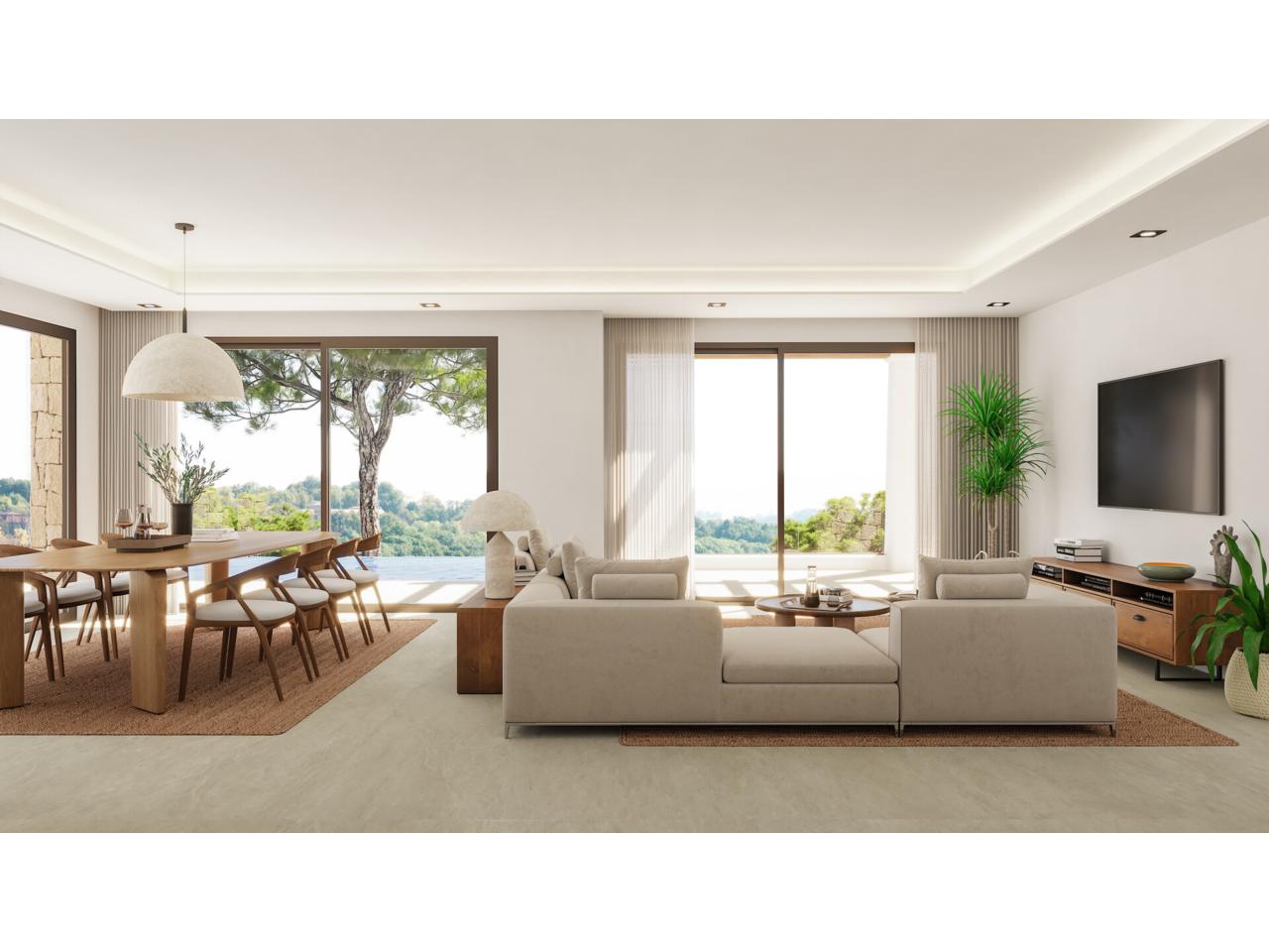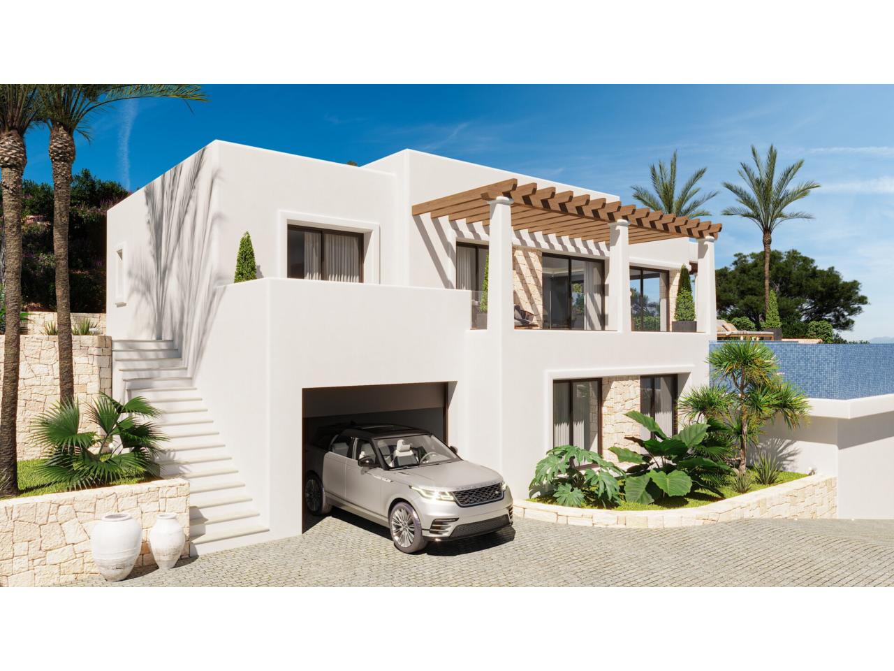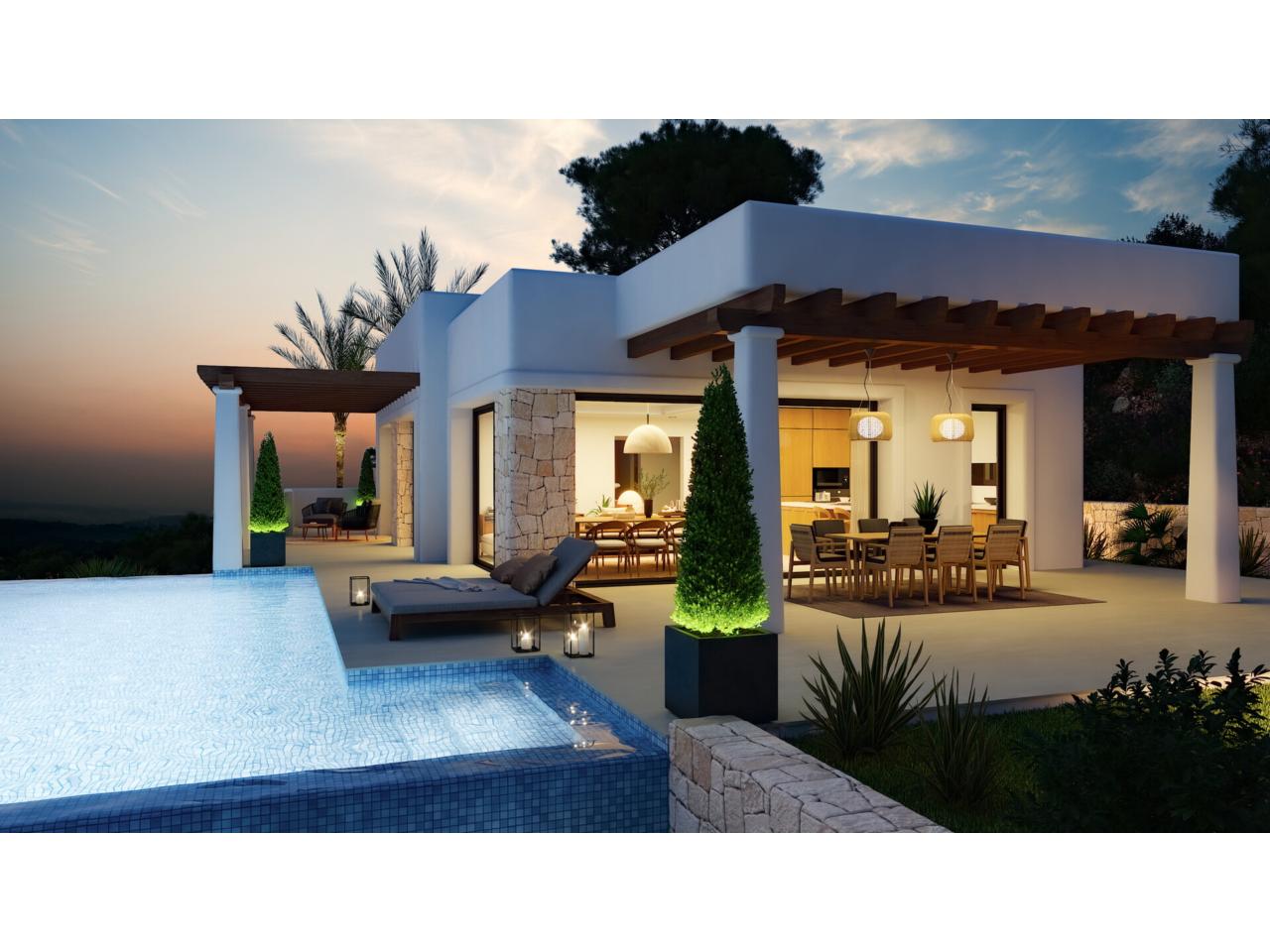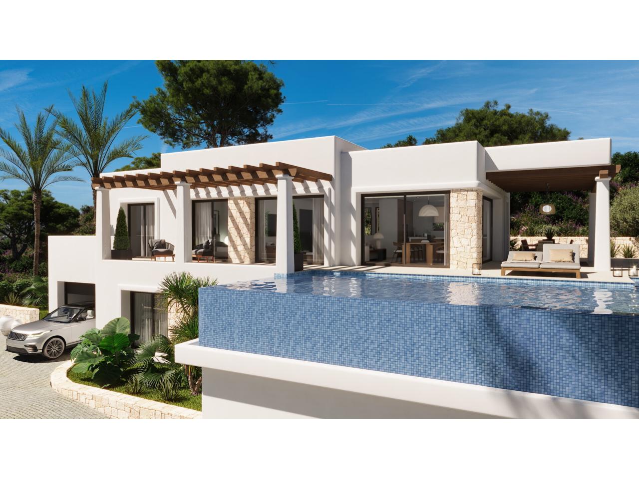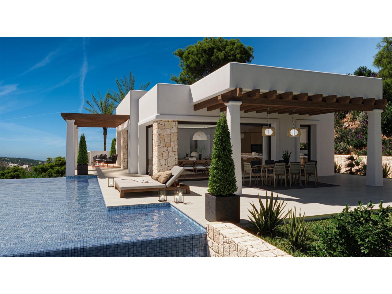 En el exterior, la villa ofrece una terraza cubierta con pérgola y una elegante piscina infinita, perfecta para disfrutar del clima soleado durante todo el año y de unas vistas despejadas que aportan sensación de amplitud y tranquilidad.