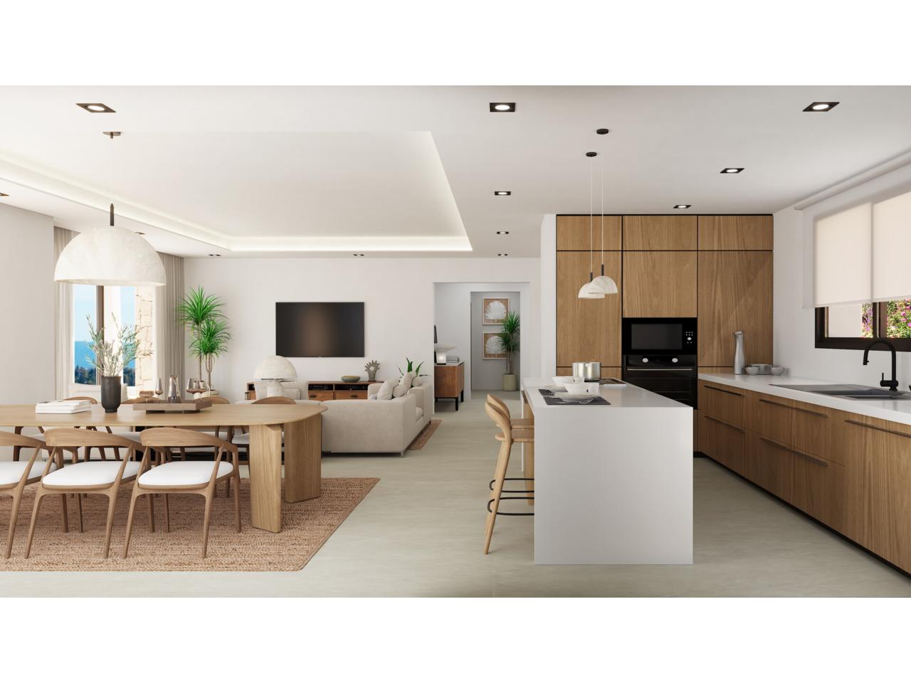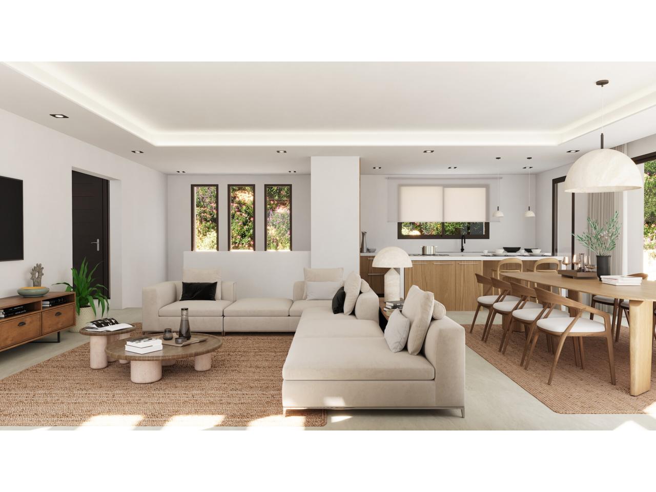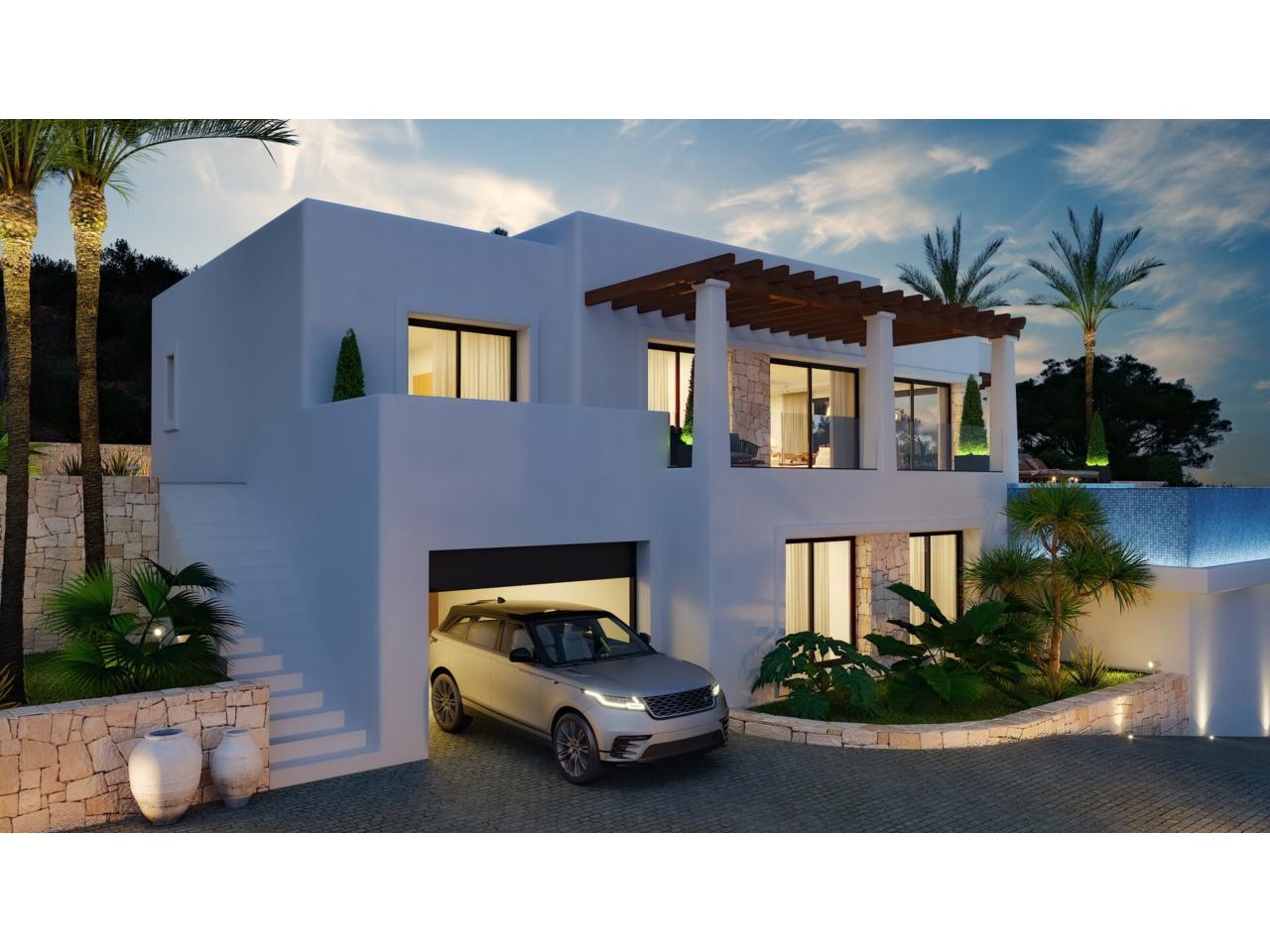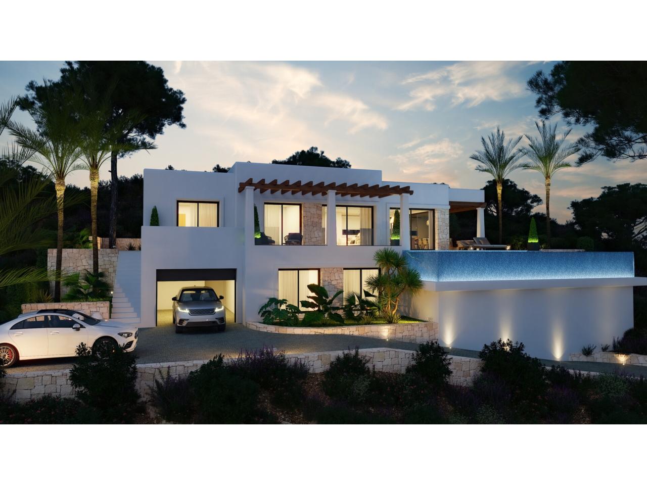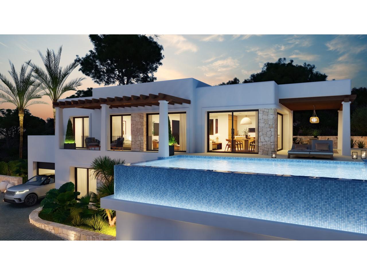 En el exterior, la villa ofrece una terraza cubierta con pérgola y una elegante piscina infinita, perfecta para disfrutar del clima soleado durante todo el año y de unas vistas despejadas que aportan sensación de amplitud y tranquilidad.